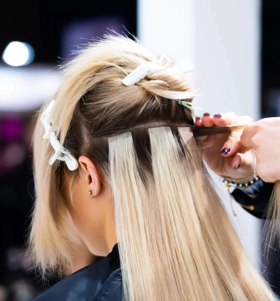 Professional woman applying hair extensions with different types of grips. Nano rings extensions made from real humas hair.