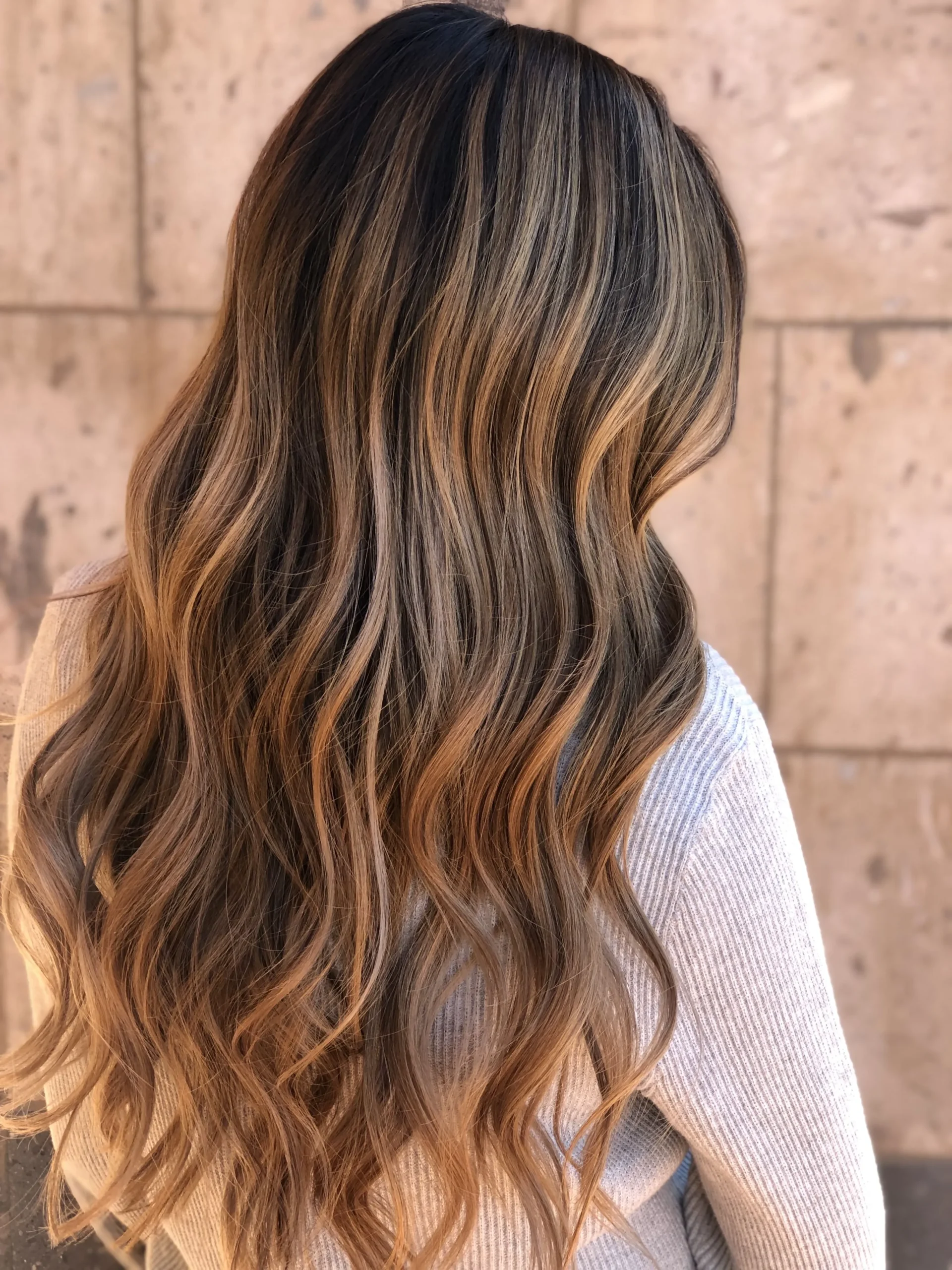 Indulge in the richness of caramel balayage. Perfect for adding warmth and depth, this style creates a beautiful blend that complements your light brown base with golden, caramel-like tones.